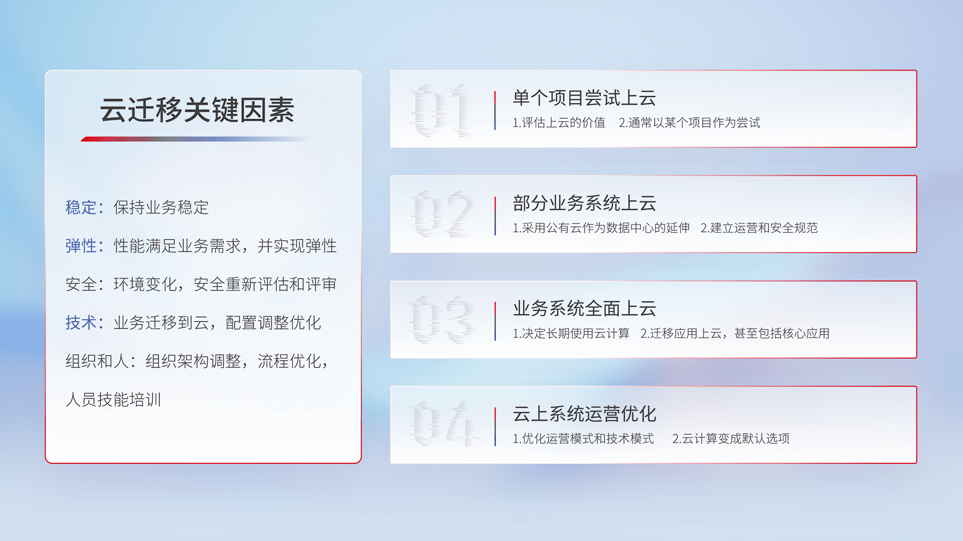 结合实际业务,,,,从规划设计、、、云平台选型、、、云原生改造、、、、数据迁移、、、、集成交付,,,,迁移全过程为客户识别最佳上云路径,,做好风险识别管理,,,,设计网络架构、、、、身份权限、、安全审计合规、、、操作审计、、、、日志审计、、、、监控告警策略、、多站点容灾设计等,,对云上基础设施进行整体规划,,提升IT治理水平,,,,以满足弹性、、、高可用、、、高性能的需求。。