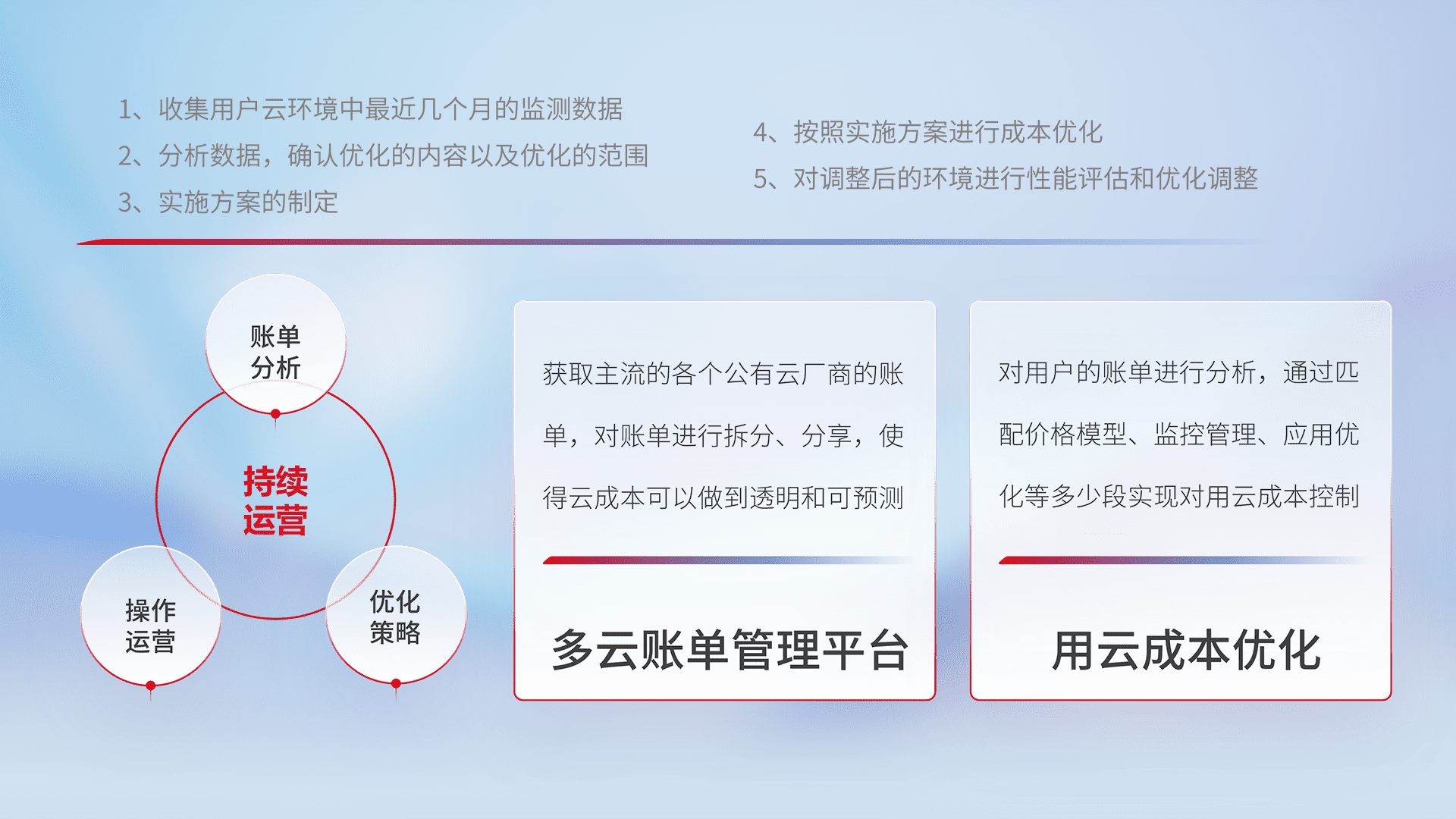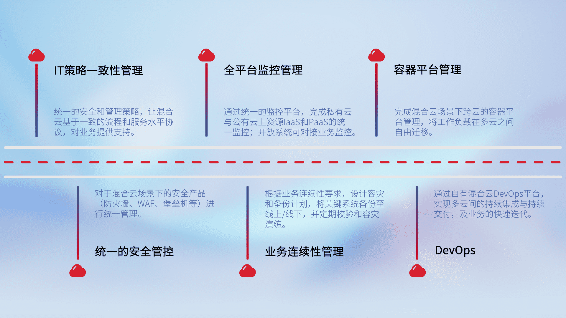 通过多云纳管,,以统一的资源数据模型把客户的云资源进行抽象和封装,,进而实现对多云资源的统一操作,,,保障云资源管理的可靠性、、稳定性与可用性。。。。量身定制化运维内容,,配置、、、、开发运维、、、补丁管理、、、备份、、监控、、、、认证和访问管理、、、、审计和日常巡检等,,,,保障在用云过程中的可靠度,,,稳定度以及高可用率。。